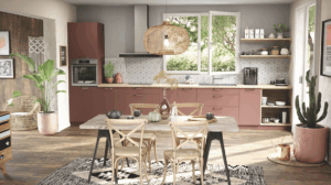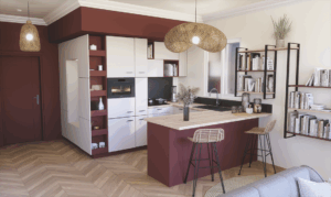 Le bois structuré, présent sur les façades et l’îlot central, confère chaleur et authenticité à la pièce.